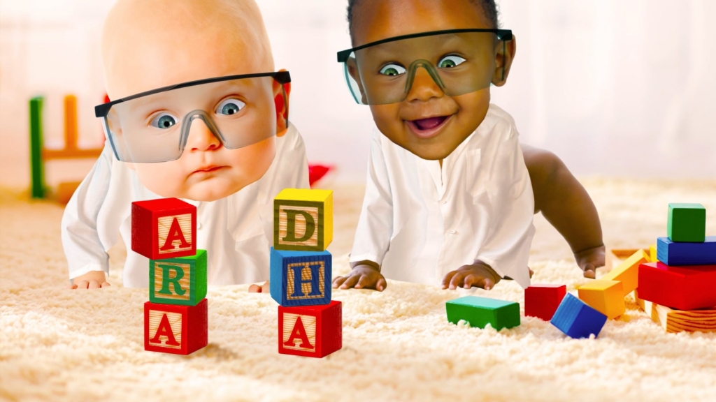 A 2D cutout collage animation presenting clinical trial results on infant formula composition, with babies as the main characters.